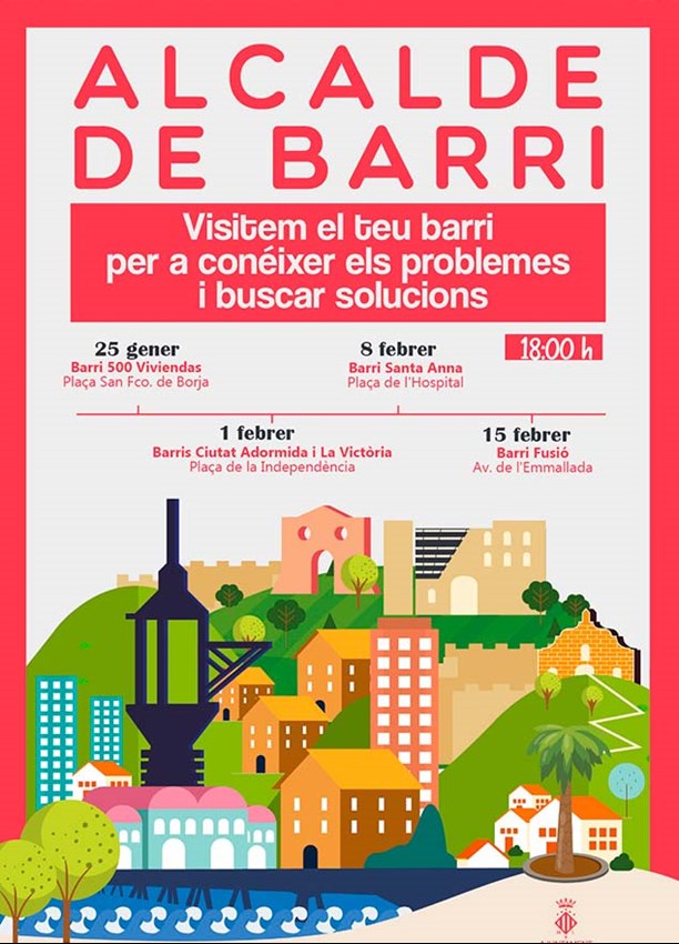 La iniciativa Alcalde de barri continua la seua marxa pels diferents veïnats del municipi de Sagunt la setmana vinent i durant el mes de febrer, en el qual l'alcalde visitarà els barris 500 viviendas, Ciutat Adormida, La Victòria, Santa Anna i Fusió. La pròxima trobada, que serà en el barri 500 viviendas, es desenvoluparà el dimarts, 25 de gener, en la plaça San Francisco de Borja a les 18.00 hores.