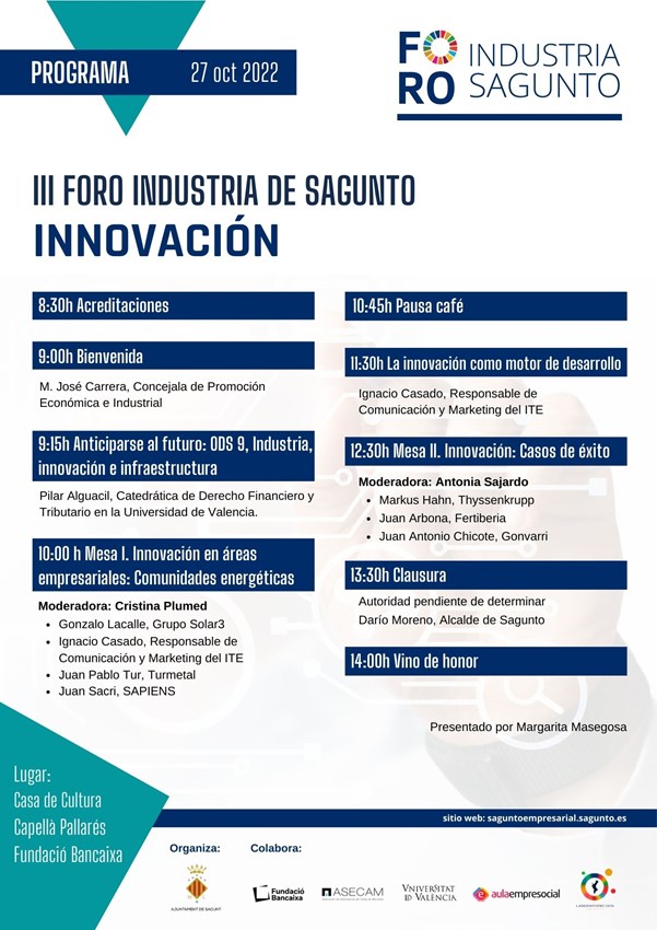Organitzat pel Departament de Promoció Econòmica i Industrial de l'Ajuntament de Sagunt, l'III El Fòrum d'Indústria de Sagunt se celebrarà dijous que ve, 27 d'octubre, a la Casa de Cultura Capellà Pallarés de la Fundació Bancaixa Sagunt