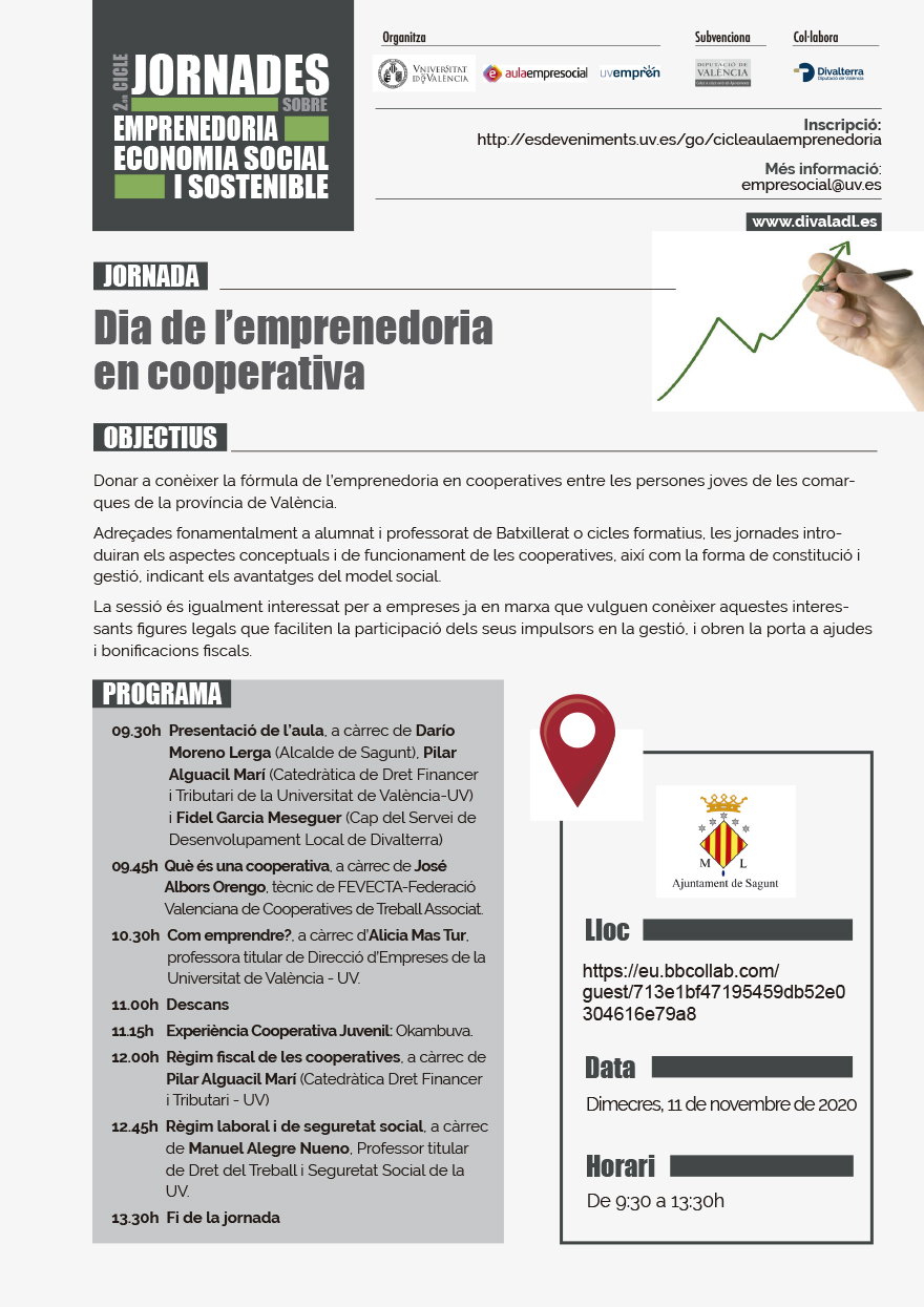 Esta activitat està emmarcada dins del 2n cicle de jornades sobre emprenedoria i economia social i sostenible organitzat per la Universitat de València (UV) a través del seu projecte Aula Empresocial, amb finançament de l'àrea de Cooperació Municipal de la Diputació de València i la col·laboració del Servici de Desenvolupament Local de Divalterra i de l'Ajuntament de Sagunt.