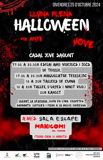 El divendres 25 d'octubre, el Casal Jove de Sagunt es convertirà en un punt de trobada per als jóvens amb ganes de passar una vesprada de diversió i terror amb la celebració de Halloween Jove (Lluna Plena), un esdeveniment ple d'activitats gratuïtes pensades per a majors de 12 anys.