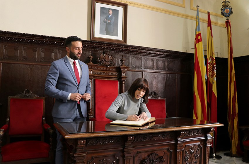 La ministra de Ciència i Innovació, Diana Morant, ha visitat l'Ajuntament de Sagunt, on l'ha rebuda l'alcalde i diverses regidores i regidors, amb la finalitat de conéixer el consistori i signar en el Llibre d'Honor de la ciutat.