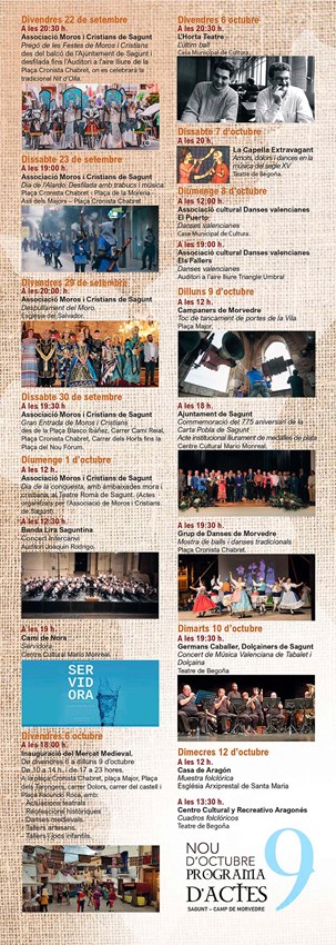 Enguany la programació del 9 d'Octubre abasta des del 22 de setembre fins al 10 d'octubre i compta amb la col·laboració de l'Institut Valencià de Cultura i de la Conselleria d'Educació Cultura i Esport de la Generalitat Valenciana.