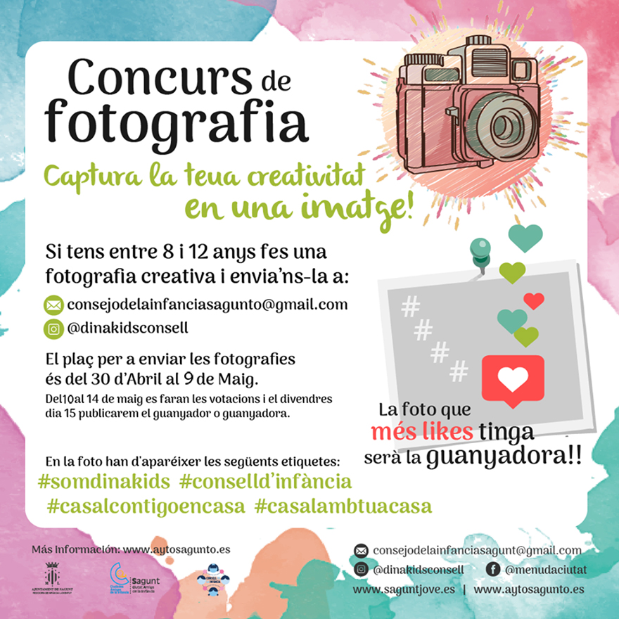Des de la Regidoria de Joventut i Infància, en la línia d'oferir oci a la ciutadania menor d'edat i amenitzar la quarantena, ha llançat un nou concurs de fotografia, en este cas, dirigit a xiquets i xiquetes d'entre 8 i 12 anys, per a fomentar la seua creativitat i combatre l'avorriment.