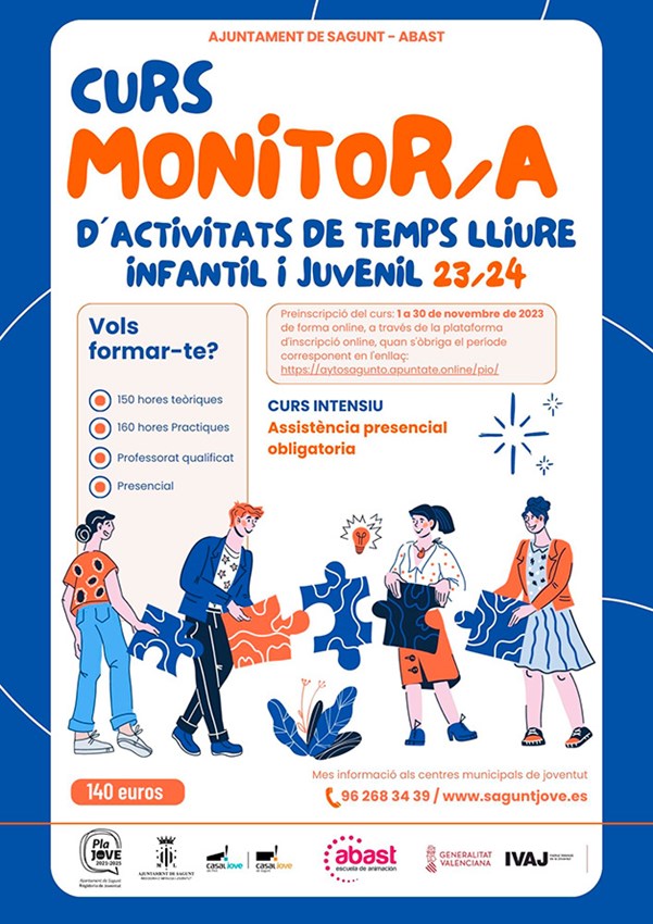 La regidoria de Joventut i Infància de l'Ajuntament de Sagunt organitza un any més el curs de monitor/a d'activitats de temps lliure infantil i juvenil. El regidor de Joventut i Infància, Roberto Rovira, informa que és «un curs que es realitza a través de l'Escola d'Animació ABAST i que, a més, està homologat per l'Institut Valencià de la Joventut (IVAJ). És un curs que capacita per a organitzar, per a dinamitzar i avaluar activitats de temps lliure educatiu amb xiquets, amb xiquetes i amb les persones més jóvens. Tot això dins d'un marc d'educació en valors».