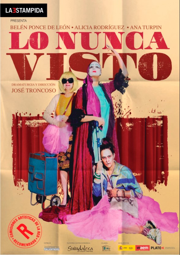 Lo nunca visto conta com, a un mes del tancament per impagaments del seu estudi, una decrèpita professora de dansa i teatre per a xiquetes, decidix que és el moment del "ara o mai" i realitzar un espectacle que revolucione l'art contemporani: "Lo nunca visto". Sense talent, sense diners i ja sense alumnes en les seues classes, es llança a reclutar “artistes compromesos” per a la seua causa. Només acudiran a la seua crida dos de les seues exalumnes: una yonki gallega i un mestressa de casa recentment escapolida. L’entrega en cos i ànima de les nostres tres protagonistes, que no tenen una altra cosa que explicar-nos més que les seues pròpies vides, ens posarà el llistó molt alt, fent-nos ballar de plor i riure de suor. Comença la funció. Fosc.