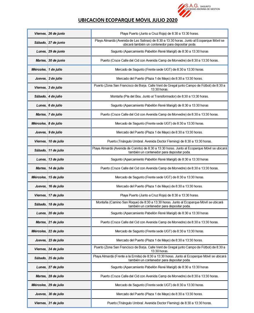 Durante el mes de julio, el ecoparque móvil se ubicará en diferentes zonas de la ciudad en el mismo horario. El miércoles y jueves, días de mercado de Sagunto y Puerto de Sagunto, el ecoparque móvil se ubicará en cada núcleo (Sagunto, frente a la sede de UGT y en Puerto de Sagunto, en la plaza 1 de Mayo). Asimismo, el viernes 3 de julio, se ubicará en la zona de San Francisco de Borja, concretamente en la calle Vent de Gregal junto al campo de fútbol y el sábado, 4 de julio, en puntos de montaña como el Pla del Bou, junto al transformador.
