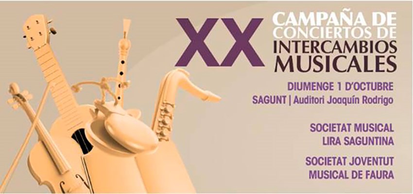 La Societat Musical Lira Saguntina i la Societat Joventut Musical de Faura oferiran un concert diumenge que ve 1 d'octubre, a les 12 hores, a l'Auditori Joaquín Rodrigo. Es tracta d'un concert que forma part de la campanya d'intercanvis musicals creada per la Federació de Societats Musicals de la Comunitat Valenciana (FSMCV). Ambdós bandes compartiran escenari dins de la XX Campanya de concerts d'intercanvis.