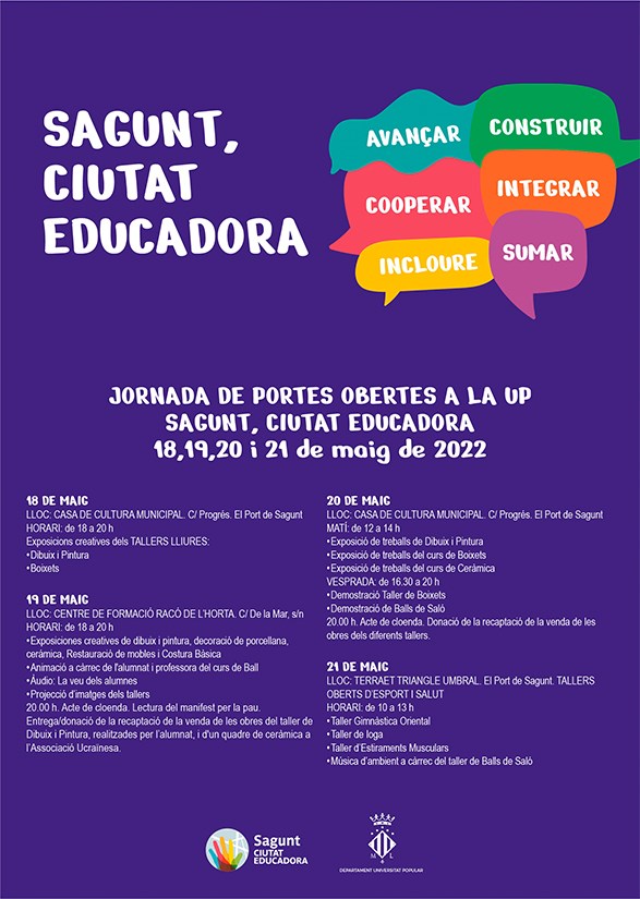 La Universitat Popular de Sagunt tanca el curs 2021-2022 amb una Jornada de Portes Obertes que celebrarà durant els dies 18, 19, 20 i 21. Hi haurà exposicions, tallers oberts, projeccions d’imatges i lliurament d’objectes solidaris a l’Associació Help Ucraïna i a altres associacions municipals, que rebran la donació d’allò que els alumnes han realitzat i sortejat a través de les seues obres.