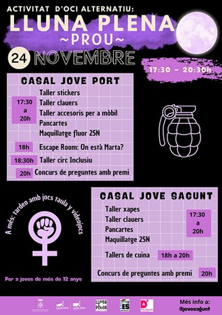 Al Casal Jove del Port de Sagunt, des de les 17.30 fins a les 20 hores, hi haurà tallers creatius, incloent-hi la confecció de stickers, clauers, accessoris per a mòbils, creació de pancartes i un maquillatge fluorescent en commemoració del 25N. A les 18 hores, els assistents podran submergir-se en un emocionant escape room titulat "On està Marta?", activitat col·laborativa amb el departament d'Igualtat de l'Ajuntament de Sagunt, i seguit per un taller de circ inclusiu a les 18.30 hores. La vesprada culminarà amb un emocionant concurs de preguntes a les 20 hores amb premis per a les persones guanyadores.