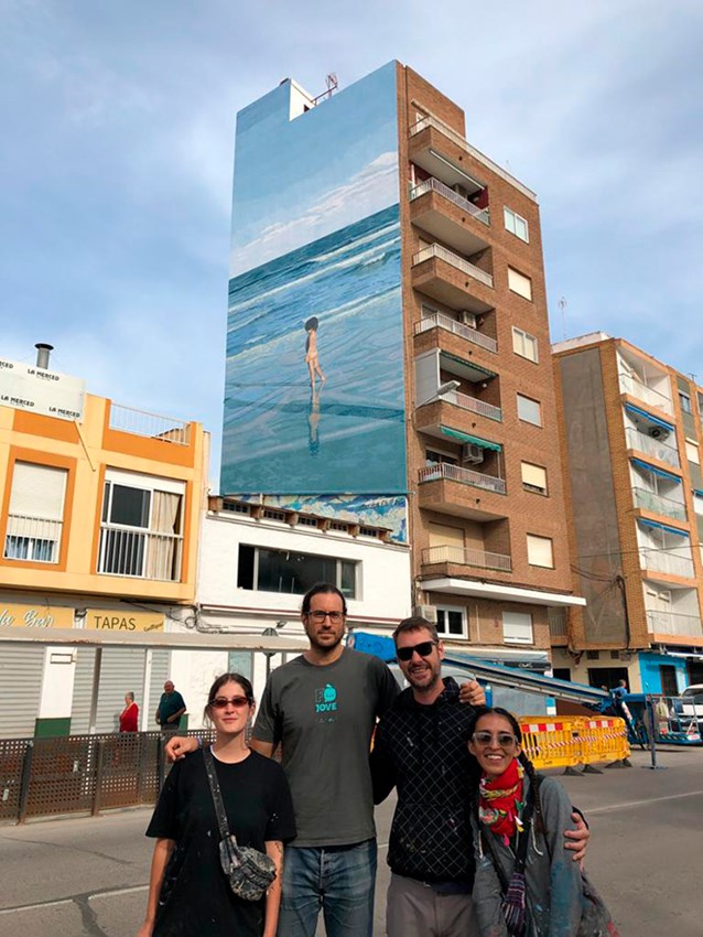 El regidor delegat de Joventut i Infància, Guillermo Sampedro, i el coordinador artístic del festival, Vicent Sánchez ‘Bize’, han visitat juntament amb les artistes el resultat d'este primer treball que dona inici a l'edició del present 2022 i que es va començar a pintar divendres passat en la paret mitgera de l'edifici de l'avinguda Mediterráneo que fa cantonada amb el carrer Hernán Cortés.