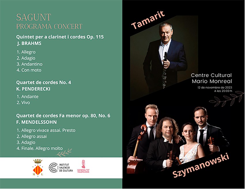 El clarinetista valencià Miguel Ángel Tamarit i el conjunt alemany Karol Szymanowski Quartet oferiran un concert de música clàssica diumenge que ve, 12 de novembre, al Centre Cultural Mario Monreal.