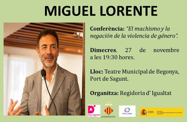 La regidoria d'Igualtat ha programat per a este dimecres, 27 de novembre, la conferència ‘El machismo y la negación de la violencia de género’, de Miguel Lorente, director de la Unitat d'Igualtat de la Universitat de Granada i tot un referent en la lluita contra la violència de gènere, ja que va ser delegat de Govern per a la Violència de Gènere des de 2008 fins a 2011. La xarrada forma part de la programació del 25N i començarà a les 19.30 hores al Teatre Municipal de Begonya del Port de Sagunt.