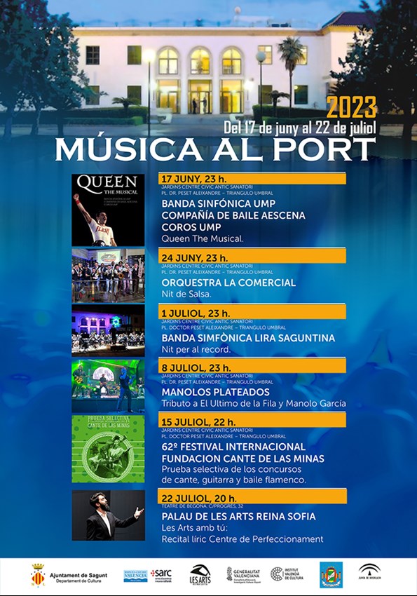 Música al Port és un festival d'accés gratuït i a l'aire lliure que està organitzat per l'Ajuntament de Sagunt, a través de la Regidoria de Cultura. Els concerts se celebraran tots els dissabtes a les 23 hores als jardins del Centre Cívic Antic Sanatori, exceptuant l'última actuació que serà el dissabte 22 de juliol a les 20 hores en el Teatre de Begoña.