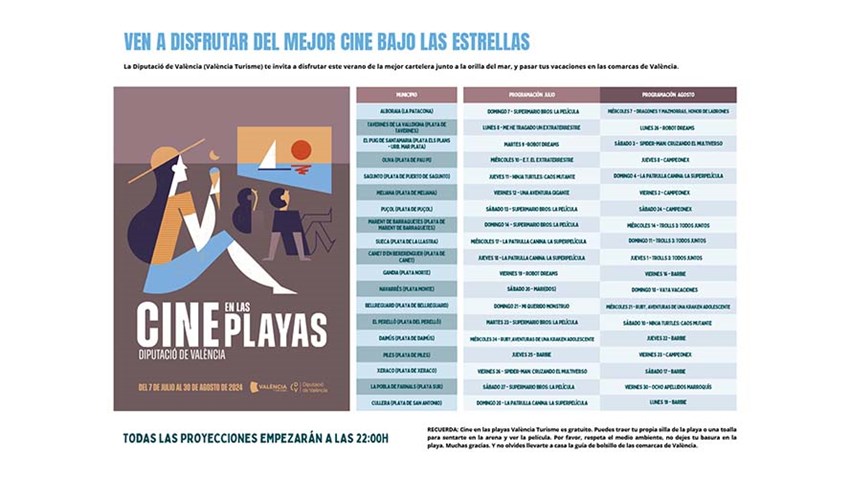 En cada una de las sesiones de cine se habilitará una pantalla inflable especial para este tipo de proyecciones en entornos naturales y se retirará el material después de la exhibición. Además, el apoyo del lugar de proyección se situará como punto de información turística con personal de atención al público y dos pantallas táctiles con información turística de toda la provincia, así como con vídeos promocionales de sus municipios. Estas acciones tienen el doble objetivo de ofrecer una oferta turística de ocio complementaria al sol y la playa, y crear sinergias entre la costa y el interior con el público asistente, indican desde la Diputación.