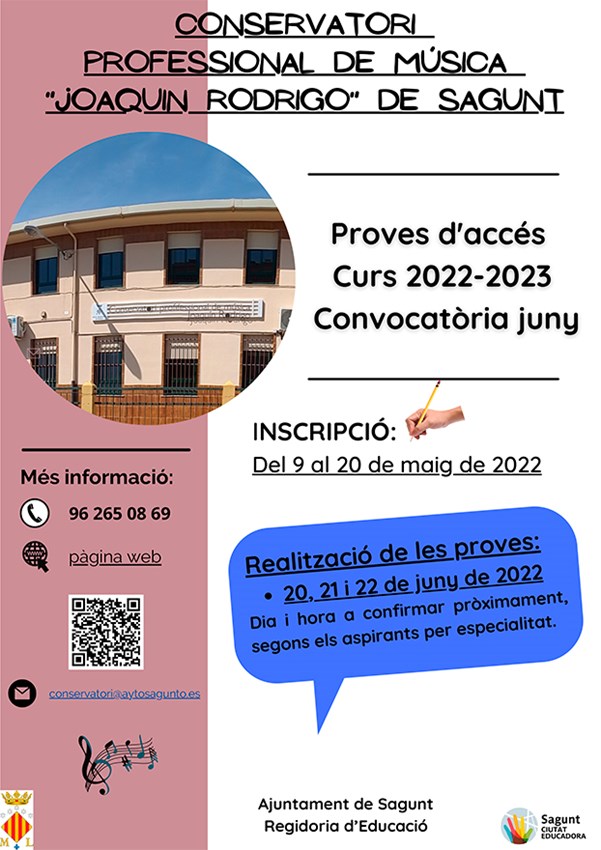 Per a més informació es pot accedir a la pàgina web del Conservatori, en l'apartat referent a les proves d'accés al mateix, enviar un correu electrònic a conservatori@aytosagunto.es o telefonar al 96 265 08 69.