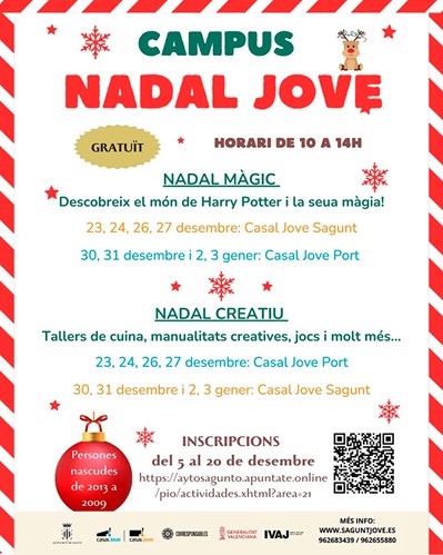 Un any més, la regidoria de Joventut i Infància de l'Ajuntament de Sagunt oferix als i les jóvens del municipi una alternativa creativa i divertida per a les vacacions de Nadal: el Campus Nadal Jove. Este campus es durà a terme tant en el Casal Jove de Sagunt com en el del Port de Sagunt els dies 23, 24, 26, 27, 30 i 31 de desembre i 2 i 3 de gener en horari de 10 a 14 hores. Està dirigit a menors d'entre 11 i 15 anys.