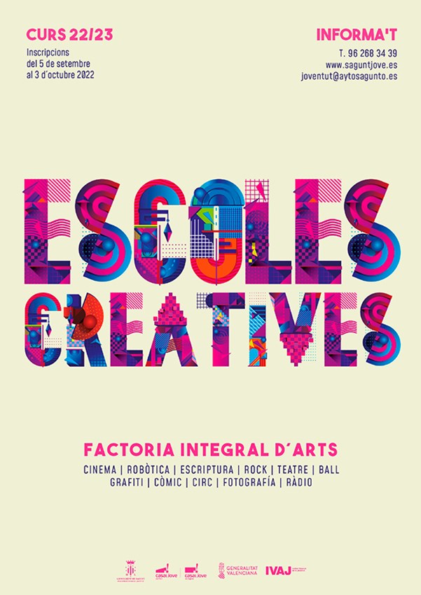 Les Escoles Creatives - Factoria integral d'arts són una iniciativa que s'emmarca dins del programa Cultura Jove de la Regidoria de Joventut i Infància de l'Ajuntament de Sagunt i les accions del departament van més enllà de la mera formació per a la creació. A esta labor se sumen altres recursos i projectes com ara les sales d'assaig, els Lab creatius o el suport a diferents projectes culturals impulsats per col·lectius juvenils. En definitiva, es tracta de fomentar l'acció creativa de la ciutadania més jove apostant per la democràcia cultural, que en lloc d'espectadors crea ciutadania.