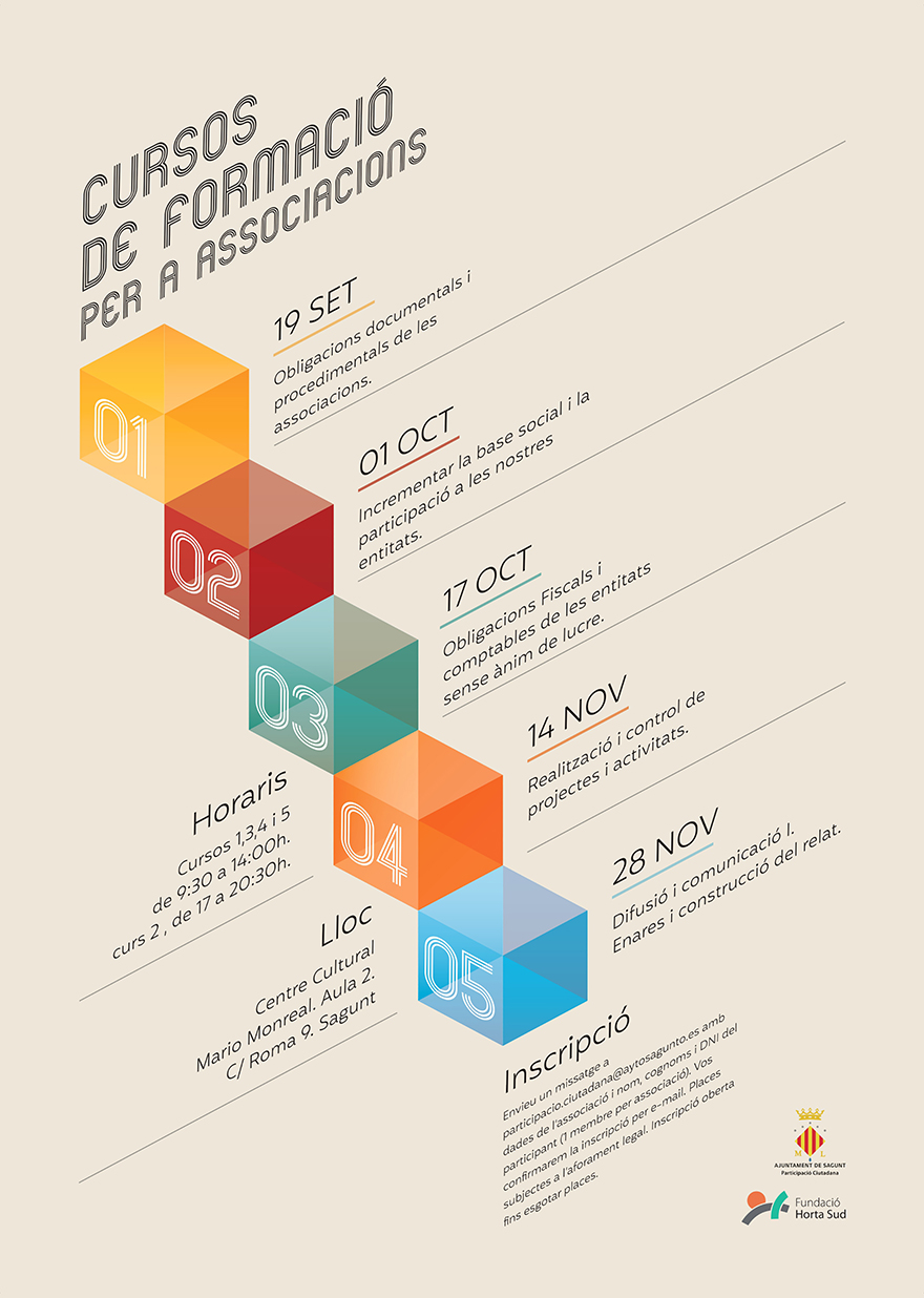 El curs inaugural va ser ‘Obligacions documentals i procedimentals de les associacions’; la pròxima cita serà l'1 d'octubre amb ‘Increment de la base social i la participació en les entitats’; ‘Obligacions fiscals i comptables de les entitats sense ànim de lucre’, el 17 d'octubre; ‘Realització i control de projectes i activitats’, el 14 de novembre, i finalment, ‘Difusió i comunicació I. Enares i construcció del relat’, el 28 de novembre. Tots els cursos s'impartiran a l'Aula 2 del Centre Cultural Mario Monreal de 9.30 a 14 hores, a excepció del curs de l'1 d'octubre que serà de 17 a 20.30 hores.