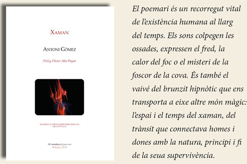 L'escriptor Antoni Gómez presentarà dimecres que ve, 1 de desembre, a les 19.30 hores en el Centre Cultural Mario Monreal el seu nou poemari, Xaman, editat per Onada Edicions amb la col·laboració del Departament de Cultura de l'Ajuntament de Sagunt i que va obtindre el Premi de Poesia Josep Maria Ribelles de la Vila de Puçol en la seua 24a edició.