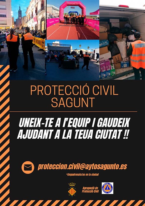 L'agrupació de Protecció Civil ha proporcionat un cartell que es difondrà per xarxes i en panells informatius, on apareix el correu proteccion.civil@aytosagunto.es, perquè qualsevol persona major d'edat i empadronada a la ciutat puga iniciar les gestions per a unir-se com a voluntari o voluntària.