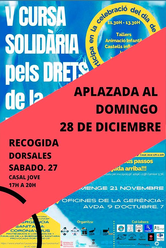 La V Carrera Solidària pels Drets de la Infància a favor d'UNICEF, que se celebrava este diumenge 21 de novembre, s'ajorna al pròxim diumenge 28 de novembre de 2021 a causa de la predicció meteorològica que preveu pluges per a tot el dia, amb un 85% de probabilitat. Esta activitat l'organitza la regidoria de Joventut i Infància de l'Ajuntament de Sagunt.