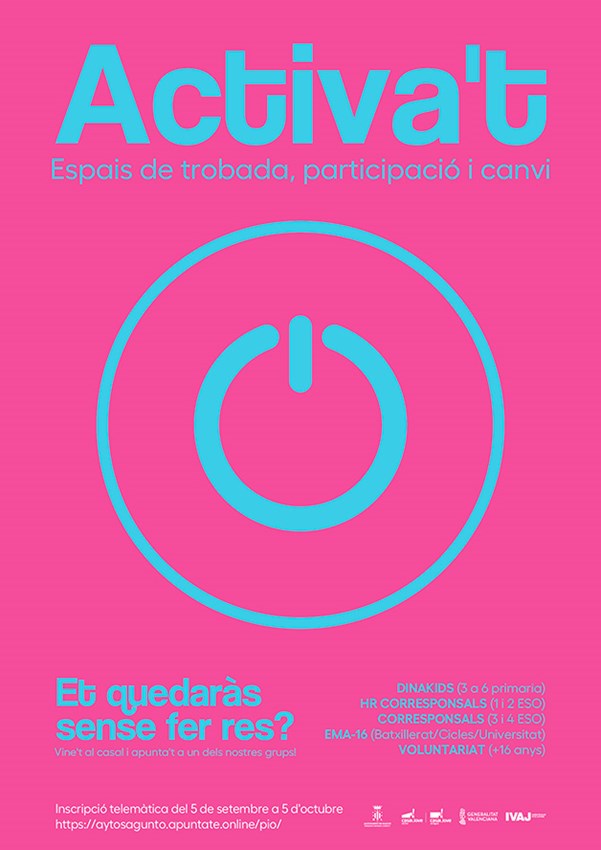 Per a més detalls sobre com inscriure's i els horaris de les reunions dels grups, visiteu el nostre lloc web a www.saguntjove.es o poseu-vos en contacte amb nosaltres al 962683439 i 962655880 o joventut@aytosagunto.es.