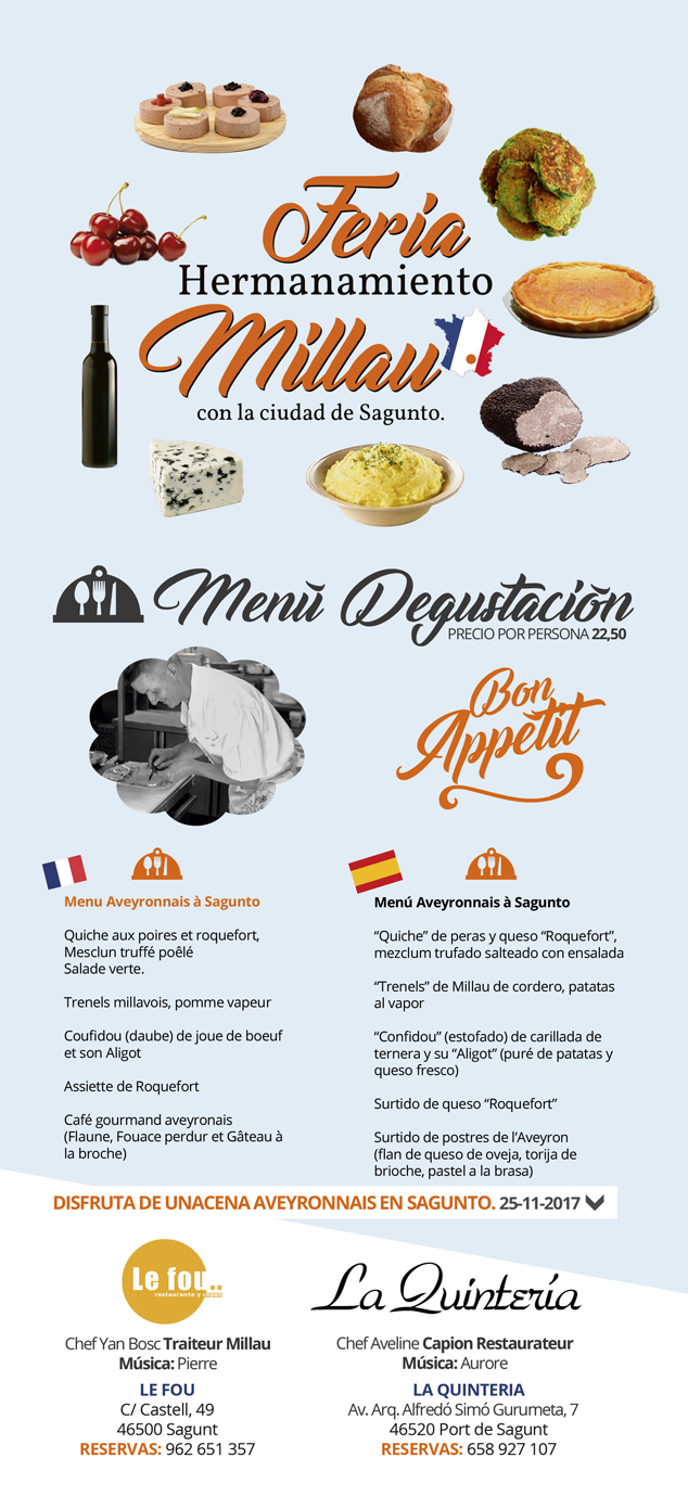 D'altra banda, des de les 9 hores fins a les 14 h., el Mercat Municipal de Sagunt acollirà una degustació i venda de productes de la regió d'Avairon, com formatge roquefort, tòfones, aligot, vins de denominació francesa, cireres i melmelades. La venda de productes serà en la parada Nº 9. A les 11 hores tindrà lloc l'acte d'inauguració de la Fira d'Agermanament Gastronòmica de Millau per part de l'alcalde de Sagunt, Quico Fernández, i la delegada de Turisme i d’Agermanament, Natalia Antonino. Mitja hora després, a les 11.30 h, hi haurà una gastrofurgo en el pati del mercat amb degustació de productes de Millau i cervesa artesanal Murbitter, que, a més, comptarà amb animació musical d'un músic de Millau.