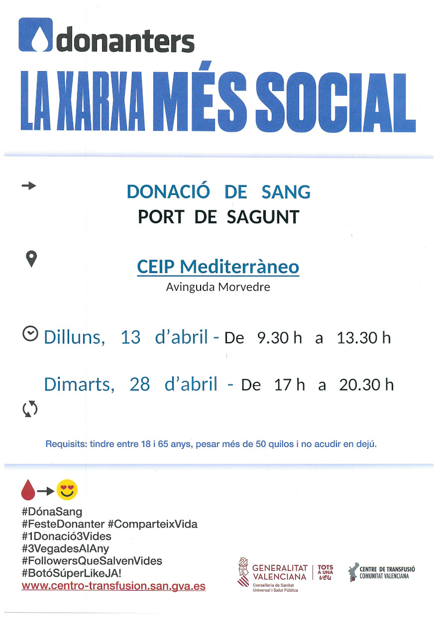 La ciutat de Sagunt acull la campanya ‘Donaters. La xarxa més social’, que està duent a terme el Centre de Transfusió de la Comunitat Valenciana. Els ciutadans podran continuar donant sang en els dos nuclis urbans de la ciutat. Després de l'èxit obtingut en la primera sessió del 31 de març, en el CEIP Mediterrani de Port de Sagunt, hui 3 d'abril, Sagunt acollirà una donació de sang en el CEIP Cronista Chabret fins a les 20.30 hores. També s'han proposat dues iniciatives més per a este mes, com són les donacions per al dilluns 13 d'abril, de 9.30 a 13.30 i el dimarts 28 abril, de 17 a 20.30 h, en el CEIP Mediterrani de Port de Sagunt.