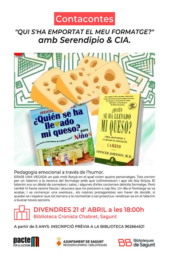 Aprofitant esta efemèride, el departament d'Arxiu i Biblioteques també ha organitzat Qui s’ha emportat el meu formatge, una sessió de contacontes a càrrec de Serendipio & CIA que se celebrarà el divendres 21 d'abril a les 18.00 a la biblioteca Cronista Chabret de Sagunt. Esta activitat de pedagogia emocional a través de l'humor està enfocada per a xiquets de a partir de cinc anys.