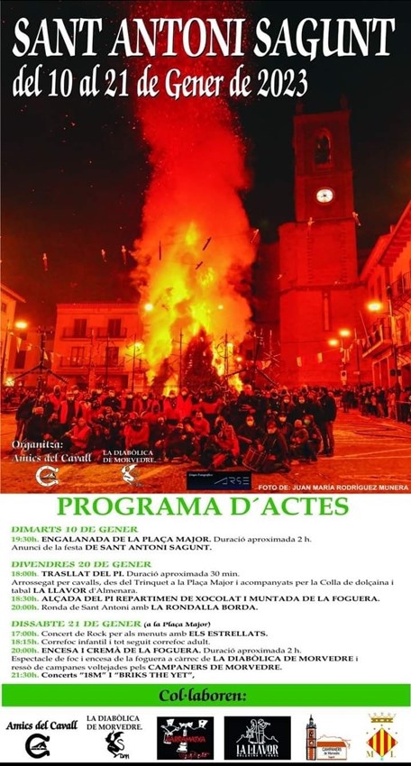 Des de l’Associació Diabòlica de Morvedre han explicat en què consistiran els actes i han destacat que «estan molt contents i contentes de de tornar a la normalitat i que han fet una programació tenint molt en compte als menuts». Així doncs, el dissabte, 21 de gener, a les 17 hores, hi haurà un concert de rock per als més menuts de la mà del grup Els Estrellats. Posteriorment, a les 18.15 hores tindrà lloc un correfoc infantil que discorrerà des de Camí Reial i que comptarà amb la Colla Jove del Ball de Diables de l'Hospitalet de l'Infant i la Diaboliqueta de Morvedre. A les 19 hores començarà el correfoc adult des de la plaça Major amb les colles de Diables El Peirot de Tremp, la Colla Vella del Ball de Diables de l'Hospitalet de l'Infant, Diables de Castelló, Dimonis Socarrats de Campanar i la Diabòlica de Morvedre. A les 20 hores serà l'esperada encesa de la foguera i el toc de campanes voltejades pels Campaners de Morvedre. Finalment, a les 21.30 hores la clausura arribarà amb el concert de 18M i Briks the Yet. Totes estes activitats estan organitzades per l'Associació Diabòlica de Morvedre i l’Associació Amics del Cavall en col·laboració amb el departament de Festes de l'Ajuntament de Sagunt i altres associacions.