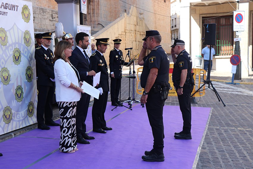 L'alcalde de Sagunt, Darío Moreno, i el comissari de la Policia Local de Sagunt, Ricardo Luis March, han passat revista als agents que es trobaven en formació. A continuació, amb la delegada de la Policia Local, María José Carrera, han entregat les mencions i felicitacions als agents.