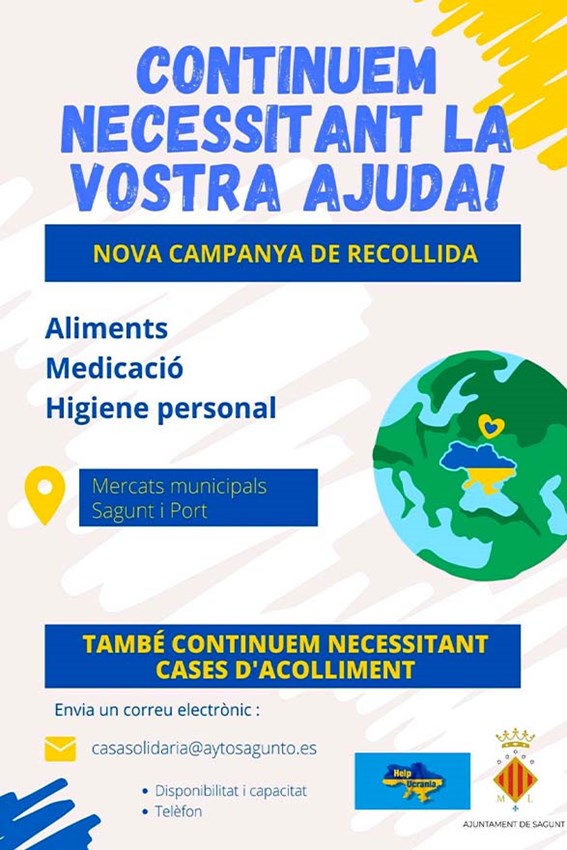 Sagunt reprén la campanya de recollida de materials per a Ucraïna. Els mercats interiors de Sagunt i Port de Sagunt s'han tornat a establir com a punts de recollida per a les donacions que la ciutadania en general vulga fer amb la finalitat d'ajudar a les persones damnificades per la invasió d'Ucraïna per part de Rússia.