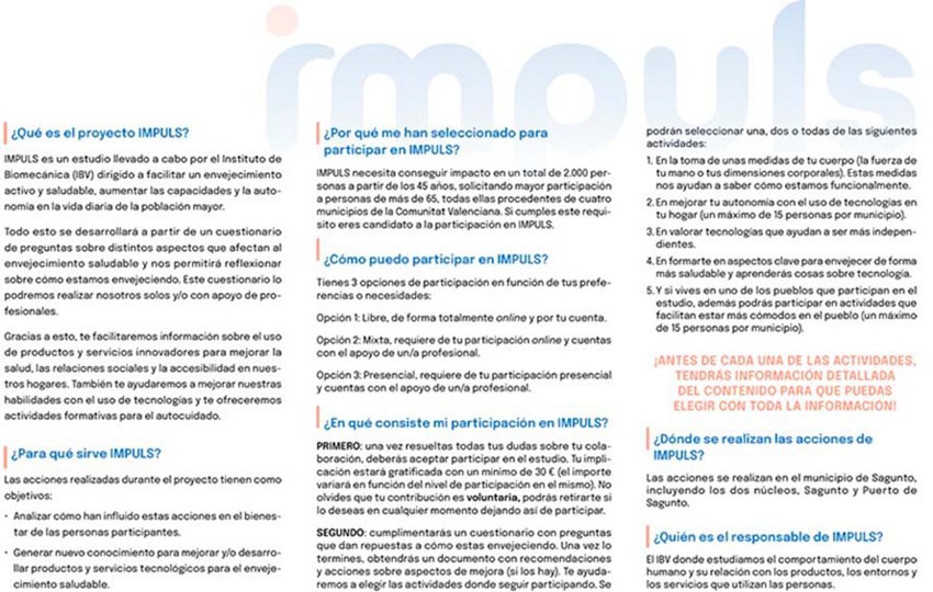 El projecte IMPULS requereix la participació de persones majors de 45 anys, amb major implicació de persones de més de 65 anys, totes elles procedents de municipis de Comunitat Valenciana com Sagunt, Alcoi, Almenara i la Mancomunitat de la Hoya de Bunyol, que han sigut escollits per a desenvolupar la investigació aplicada.