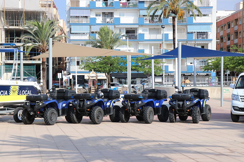 Pel que respecta als mitjans materials, la secció disposa de quatre quads policials, dos vehicles tot terreny i una embarcació. El servici de Policia de Platges comença a les 10 hores i acaba a les 20 hores.