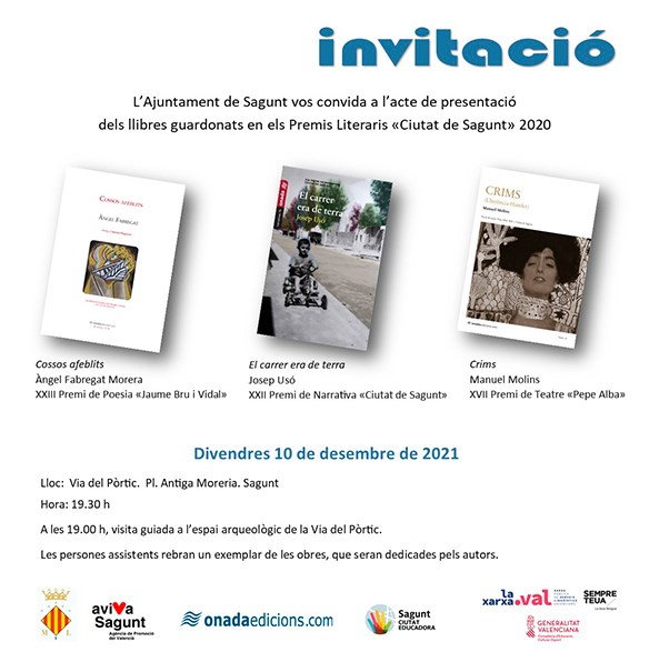 El pròxim divendres 10 de desembre es presentaran els llibres guanyadors dels Premis Literaris Ciutat de Sagunt 2020, publicats per Onada Edicions. Es tracta de la novel·la El carrer era de terra, de l’escriptor i professor Josep Usó; Cossos afeblits, poemari d’Àngel Fabregat, i la peça teatral Crims, del conegut dramaturg Manuel Molins.
