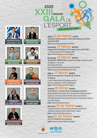 La programació començarà el dijous 13 a les 11.30 hores amb un entrenament amb Sergio Munuera, millor esportista masculí del 2024, a la sala de musculació del Poliesportiu Municipal (internuclis). Després, el divendres 14 s'inaugurarà a les 20 hores l'exposició ‘Som esport, Som ciutat 2024’ al Pavelló Poliesportiu Port de Sagunt. L'exposició és a càrrec del Grupo Fotográfico ARSE.