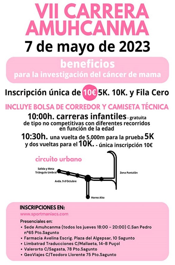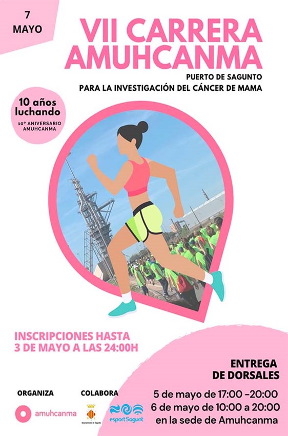 L'Asociación de Mujeres y Hombres afectats de Cáncer de Mama (Amuhcanma) celebrarà este diumenge, 7 de maig, la setena edició de la seua Carrera Solidària que consistirà en dos carreres no competitives de 5 i 10 quilòmetres, el període d'inscripció de les quals finalitza hui. La carrera infantil començarà a les 10 hores i a les 10.30 hores tindrà lloc la dels adults en un circuit urbà al Port de Sagunt, l'eixida del qual serà al carrer doctor Fleming (Triangle Umbral).