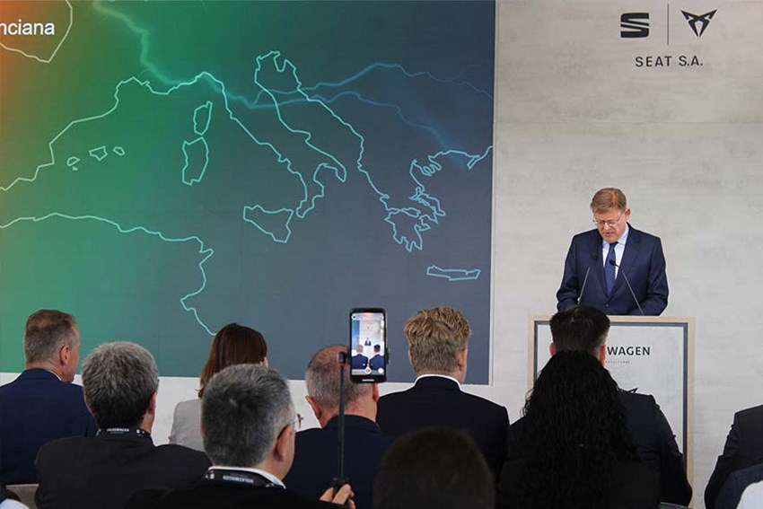 El nou projecte del grup Volkswagen i Seat per a crear una gigafactoría de bateries per a cotxes elèctrics a Sagunt s'ha presentat este matí en Parc Sagunt II. La iniciativa comptarà amb el suport dels fons europeus 'Next Generation'. En l'acte han participat el president del Govern d'Espanya, Pedro Sánchez; el president de la Generalitat Valenciana, Ximo Puig; el president del Grup Volkswagen, Herbert Diess i el membre del Comité Executiu de Volkswagen AG responsable de Tecnologia i president del Consell d'Administració de SEAT S.A., Thomas Schmall.