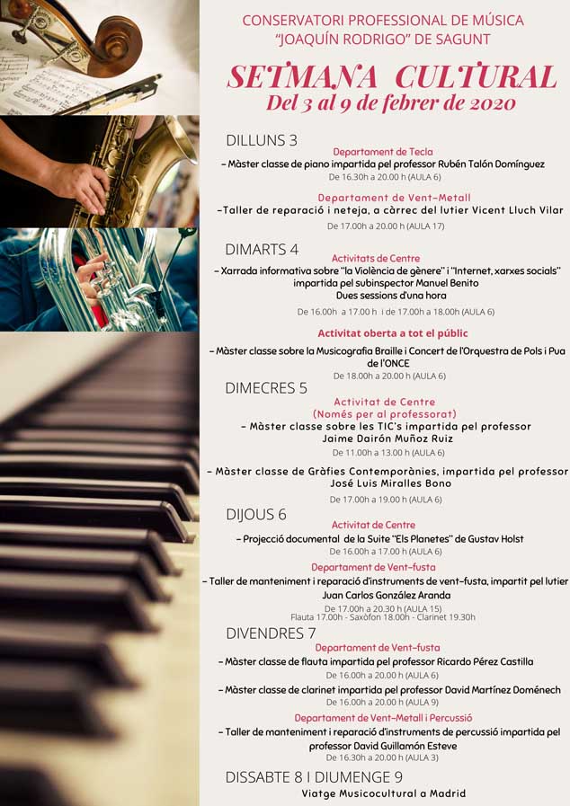 El Conservatori Professional de Música Joaquín Rodrigo de Sagunt celebrarà la setmana vinent, del 3 al 9 de febrer, la seua Setmana Cultural amb diferents classes magistrals, tallers de manteniment i reparació d'instruments musicals i xarrades sobre violència de gènere i Internet, a més d'altres més.