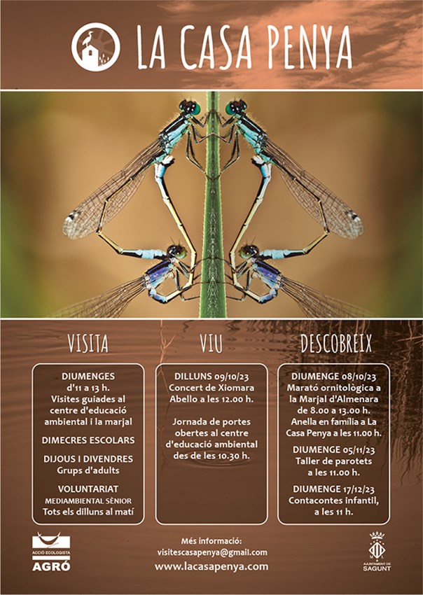 Esta tardor Acció Ecologista-Agró i l’Ajuntament de Sagunt organitzen quatre jornades per a viure i descobrir La Casa Penya. La primera, el diumenge 8 d’octubre, amb una marató ornitològica. El dilluns 9 d’Octubre se celebrarà un concert i una jornada de portes obertes. Per al diumenge 5 de novembre hi ha un taller de parotets i, el diumenge 17 de desembre, un contacontes infantil. A més, estan el voluntariat sènior dels dilluns, les visites guiades dels diumenges i les visites per a centres educatius i grups d’adults entre setmana.