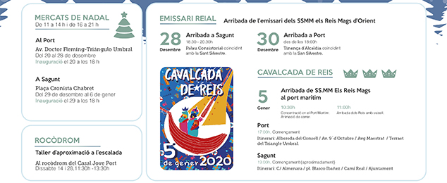 El plat fort de la programació nadalenca arribarà el 28 i el 30 de desembre amb l'arribada de l'emissari reial de Ses Majestats els Reis Mags a l'Ajuntament de Sagunt i a la Tinència d'Alcaldia, respectivament, i amb la Cavalcada de Reis, el 5 de gener. Eixe mateix dia, com ja és tradicional, Melcior, Gaspar i Baltasar arribaran amb vaixell a la dàrsena del port marítim a les 11 hores, on seran rebuts per les autoritats de Sagunt i on el públic infantil podrà demanar-los els seus desitjos.