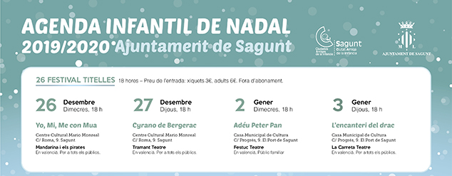 Durant les festes nadalenques el Centre Cultural Mario Monreal i la Casa Municipal de Cultura acolliran el 26 Festival de Titelles amb espectacles per a tots els públics i en valencià. El dimecres 26 de desembre, la companyia Mandarina i els pirates posaran en escena Yo, Mi, Me con Mua i el dijous 27 de desembre Cyrano de Bergerac a càrrec de la companyia Tramant Teatre, els dos espectacles a Sagunt.