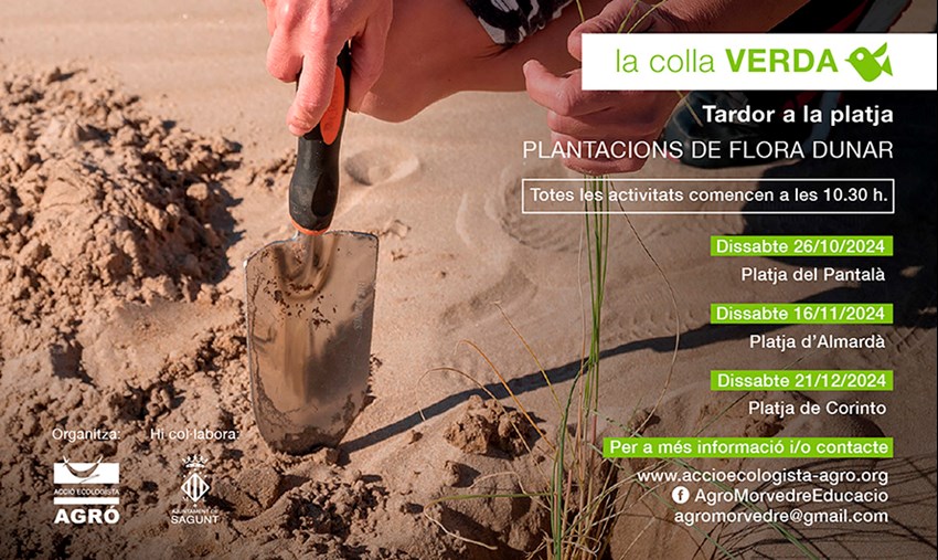 En arribar la tardor és tradició que La Colla Verda convoque a la societat civil per reforçar les plantacions de flora dunar que des de fa dècades realitza a les platges de Sagunt, precisament amb l’objectiu de protegir-les de l’erosió litoral. Enguany, com no podia ser d’altra manera, el projecte de voluntariat ambiental de l'Ajuntament de Sagunt (Camp de Morvedre, València) i Acció Ecologista-Agró, ha organitzat una nova campanya per continuar posant el seu granet d’arena en la conservació dels ecosistemes dunars de la capital de la comarca. La primera serà el pròxim dissabte 26 d'octubre a la platja del Pantalà del Port de Sagunt.