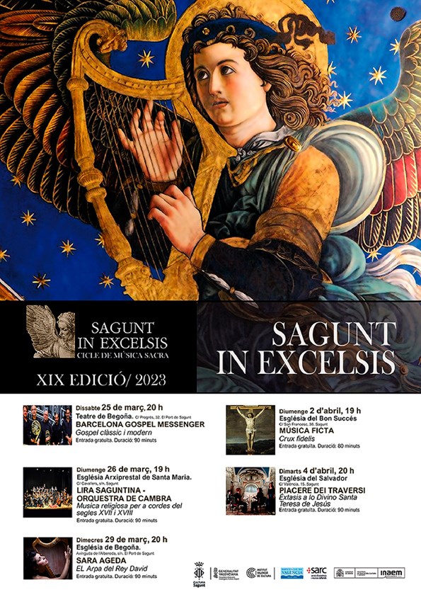 Este dissabte 25 de març torna el cicle de música sacra Sagunt in Excelsis. En esta ocasió comptarà amb cinc concerts que és realitzaran entre el nucli de Sagunt, amb tres concerts; i el nucli de Port de Sagunt, amb dos concerts. A més, Asun Moll, regidora de cultura, ha puntualitzat: «Comencem amb un concert de música gòspel en el Teatre de Begoña, que serà este dissabte, esteu totes i tots convidats per a gaudir. I els altres quatre ja seran dins de les esglésies: Begoña, El Salvador, Buen Suceso i Santa Maria.»