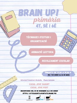 D'altra banda, el BRAIN UP! Primària està destinat, en esta ocasió, a l'alumnat de quart, cinqué i sisé de Primària. L'activitat es durà a terme els dimarts de 17.30 a 19.30 hores als Casals Joves de Sagunt i el Port de Sagunt des del 9 de gener fins al 26 de març. En esta activitat s'aprendran tècniques d'estudi i organització de l'estudi, s'animarà a la lectura i es farà reforç escolar.