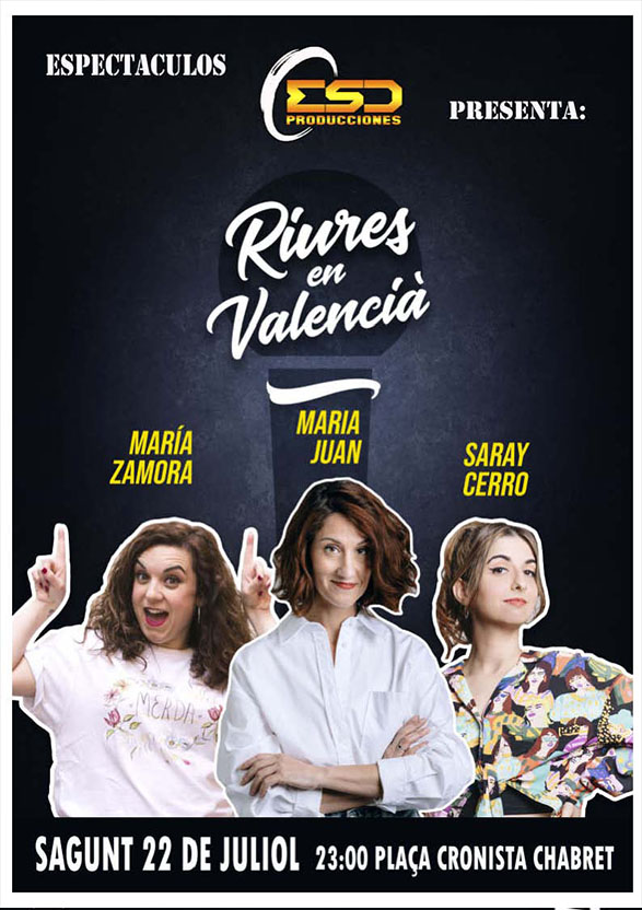 El departament de Festes i Cultura Popular de l'Ajuntament de Sagunt ha programat per a demà, dijous 22 de juliol, l'espectacle Riures en Valencià, el qual està emmarcat dins de la programació del festival Estiu a la Fresca. Així mateix, es tracta d'un número d'humor oferit per tres dones monologuistes.