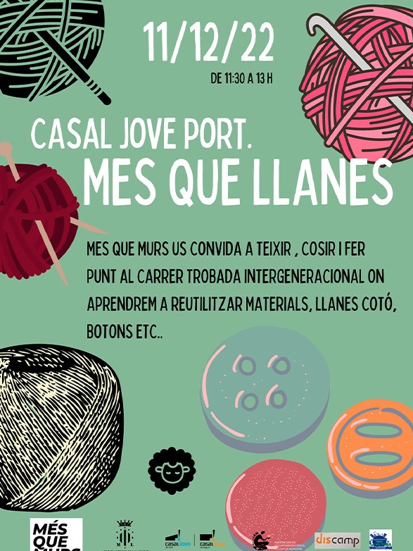 Diumenge que ve, 11 de desembre, entre les 11:30 i les 13 hores, tindrà lloc Més Que Llanes al pati del Casal Jove del Port de Sagunt, una trobada on persones de diversa procedència i edats s'uniran per aprendre a reutilitzar materiales , llanes, cotó, botones, etc. L'activitat està oberta a qualsevol persona interessada a ensenyar o aprendre a teixir, cosir, fer punt, etc. i posarà el punt final del festival d'Art Urbà Més Que Murs.