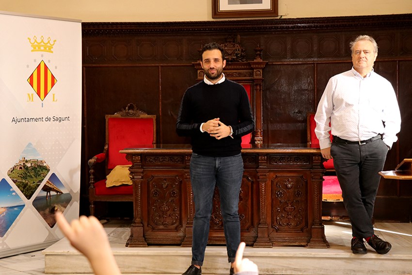L'alcalde de Sagunt, Darío Moreno, i el regidor delegat d'Educació, Josep Manuel Tarazona, han rebut este dijous la visita d'un grup d'escolars de segon curs de Primària del CEIP Montíber (antic Villar Palasí).