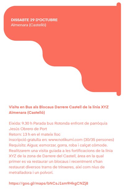 En esta excursió es farà una visita guiada als escenaris de la Guerra Civil situats darrere del castell d'Almenara i que formaven part de la ‘Línia XYZ’. En esta zona s'ha restaurat un blocao, diversos trams de trinxeres, nius de metralladora i un polvorí. Per al desplaçament, la Regidoria de Memòria Històrica i Democràtica disposarà un autobús amb eixida des de la parada de la rotonda enfront de la parròquia de Jesús Obrer del Port de Sagunt i amb retorn al mateix lloc sobre les 13.00 hores. La inscripció a esta activitat és gratuïta i s'ha de formalitzar a través de la pàgina web www.notikumi.com, indicant ‘Almenara’ en el cercador, o accedint directament a través de l'enllaç. Es recomana portar aigua, esmorzar, gorra i roba i calcer còmode.