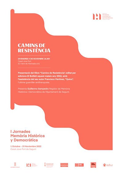 D'altra banda, la setmana pròxima, concretament el divendres 4 de novembre, a les 18.30 hores, en el Casal Jove del Port de Sagunt tindrà lloc la presentació del llibre Caminos de resistencia (Ediciones El Boletín) per part del seu autor, Francisco Martínez Quico, un dels últims guerrillers antifranquistes que encara viuen, en què conta la seua història. El regidor delegat de Memòria Històrica i Democràtica, Guillermo Sampedro, conduirà l'acte.